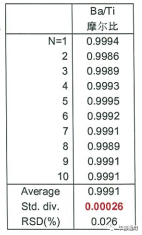 理學(xué)公司的X射線熒光光譜儀掃描道ZSX Primus III+對鈦酸鋇粉末質(zhì)量管理,其鈦鋇比標(biāo)準(zhǔn)偏差(摩爾比)~10-4。根據(jù)實(shí)測結(jié)果,ZSX Primus III+的精度在0.0002~0.0003。